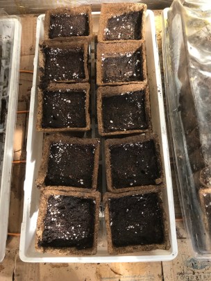 To the left are some planted trays of flower seeds and some early cole crops. The lids are off now, as some are germinating. Remember that the trays sit on heating cables, so the roots get plenty of warmth. To the right are some Cowpots, which I love, that have beets and chard, etc… plants that are better direct planted, so rather than transplanting, I put a seed in each corner of the pot and then thin out to the best three or four. Then I just plant the whole pot into a hole and they experience no shock and produce a crop earlier.