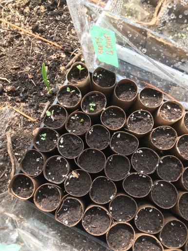 Below is an idea I am trying this year. I am using empty toilet paper tubes for planting some vegetables. I want to see if they will break down quick enough. I also hope the “collar” will deter some pests. I will keep you updated, but seeds are sprouting nicely and the tubes hold moisture well.