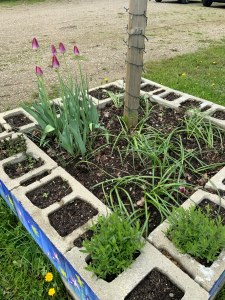 These are two of the first beds I built with cinder blocks. I love planting herbs and flowers in the cinder block holes. A great system for companion planting. On the left the huge plant is lovage (kind of like celery) which comes up every year. Note the weeds and the idle hoe.