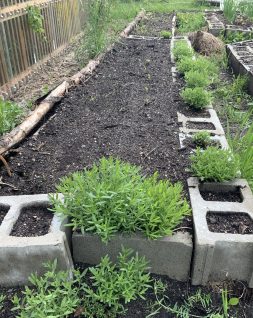 Below are three “cinder block” beds that have been in production for about four years. They require little weeding and the soil is loose and fertile, so just about anything does well. On the left, the large plant is lovage, which has a celery flavour, and there is rosemary, sage, nasturtiums, garlic, carrots coming up and a few different kinds of bean that are doing ok.