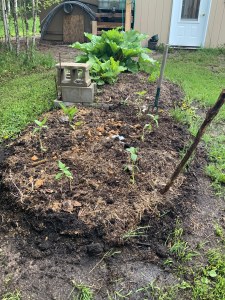 The rhubarb bed is finished after I harvested another batch. Horseradish is starting in the front. There are sunflowers on the mushroom bed to help shade things.
