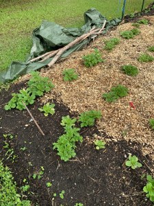 Left is the potatoes, hilled up with rotten hay left over from last year. On the right is the chaotic greenhouse. Almost all my peppers are in and you can see garlic and some large radishes. There is some lettuce regrowing in the front.