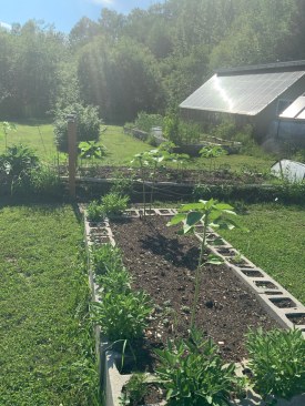 left bed has sunflowers, tomatoes, squash and some herbs…right bed is the old garlic bed, now starting cumin in the middle and pickling cukes around the edge…sunflower and some sage plants that return every year
