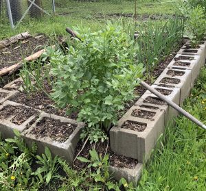 Below are three “cinder block” beds that have been in production for about four years. They require little weeding and the soil is loose and fertile, so just about anything does well. On the left, the large plant is lovage, which has a celery flavour, and there is rosemary, sage, nasturtiums, garlic, carrots coming up and a few different kinds of bean that are doing ok.