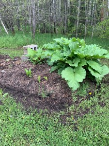 The rhubarb bed is finished after I harvested another batch. Horseradish is starting in the front. There are sunflowers on the mushroom bed to help shade things.