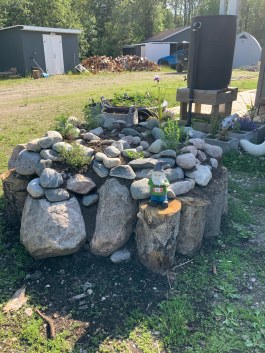 Above is the new herb bed I constructed one afternoon. It is out front. We store a lot of water for the gardens (the barrel) in case the well pump ever quits. Sage, rosemary, thyme, peppermint and chives so far.