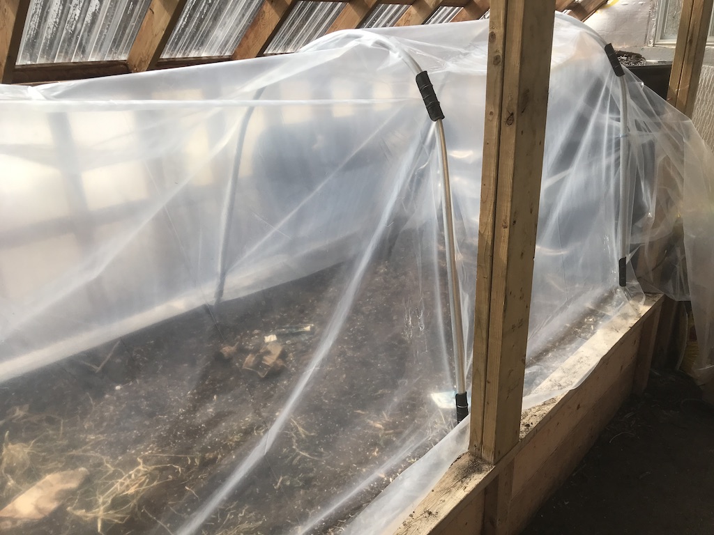 After seeds begin to do their things, I will need to open the tent on hot days, so making a door will happen in the next couple of days. I have used metal electrical conduit, which pretty much lasts forever. Last year all the PVC tubing I used got so hot it melted. Even now, a sunny days means temps in the greenhouse are in the 30C range.