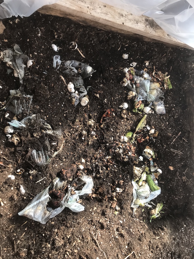 So I save all of our home compost in the greenhouse over the winter. It is in fully compostable bags. These bags are terrific, as they break down quickly. Quite impressive. So I have this disgusting heap of bags to deal with in the spring. The greenhouse gets HOT. A cold spring day and sunshine will boost the temp to 30C no problem. And the greenhouse retains a lot of that heat with some help.