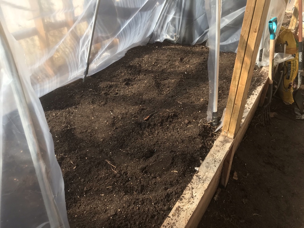 So now the greenhouse is a composter. First, I move the soil aside from one side of the bed. That was as deep as I could go, as the ground was still frozen (just a few days ago), but I am good with that.